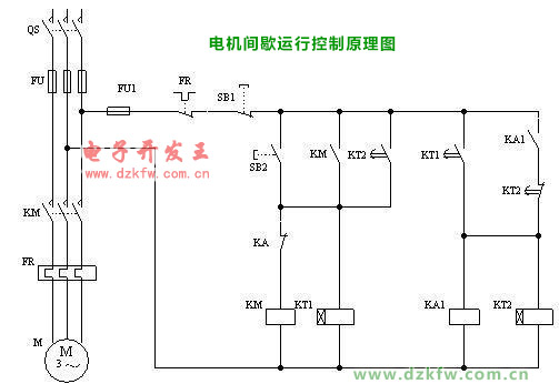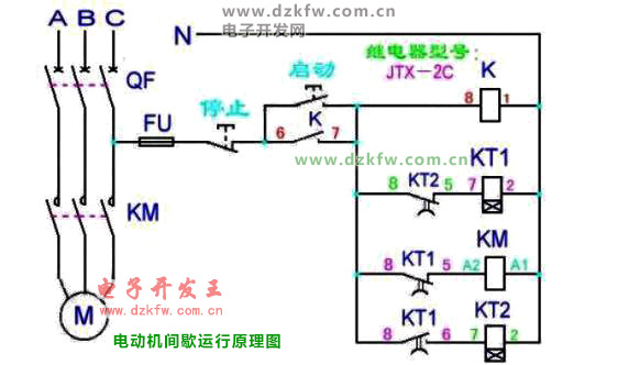 从上面的动作过程可以看出,电动机开始启动,KT1线圈开始得电计时,KT1延时触点动作,电动机停止运行,所以电动机运行时间。就是时间继电器KT1的设定时间;电动机停止的同时,时间继电器KT2线圈得电开始计时,延时触点动作电动机开始启动,所以时间继电器KT2设定时间就是电动机间歇时间。