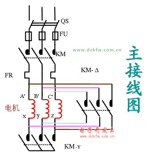 三个接触器作用:一个为主电路接通电源,一个为Y型启动,一个为△启动。