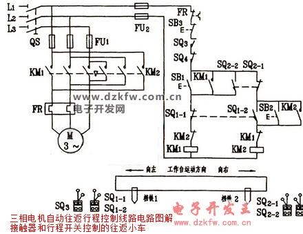 有些生产机械,如万能铣床,要求工作台在一定范围内能自动往返运动,以便实现对工件的连续加工,提高生产效率。这就需要电气控制线路能对电动机实现自动正反转控制。由位置开关控制的工作台自动往返控制线路如下图所示。它的右下角是工作台自动往返运行的示意图。