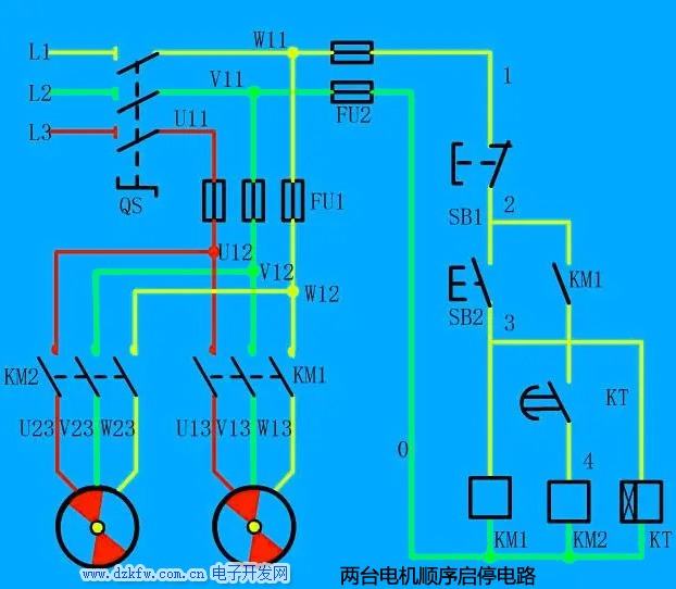 这是一个顺序启动电路,首先我们看这跟电路图,有两个电机,按钮启动按钮KM1得电吸合,同时时间继电器得电计时。