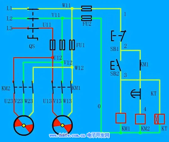 主线路:断路器出来三根火线进熔断器,然后进接触器,这里注意,KM1,与KM2的进线是一样的都是U---V----W.。而且出线部分也是一样的,没有改变相序。这个两个电机,而正反转需要改变其中两项的相序,从而改变电机转向。