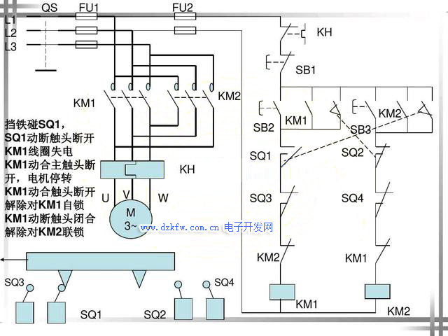 注明:行程开关SQ3,行程开关SQ4位于工作台的两侧,目的在于对电路进行极限保护,即双重行程开关用来停止电动机的极限运行,相对的更加的安全,可靠和实用。