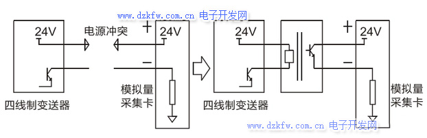 ② 解决信号电源的冲突,这时也需要加一个隔离器。