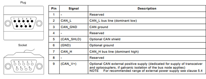 图1一般工业中最常用的9针D-Sub连接器,分公头和母头,这里值得一提的是引脚6和9在标准中也是定义了功能的,9定义为收发器/光耦合器的正极电源,但在工业领域常常会有所变化,6和9也常用做CAN设备电源电压的输入引脚,但这种技术局限性较大,因为通过引脚运输到的电流非常有限,参考标准CIA 303_1。