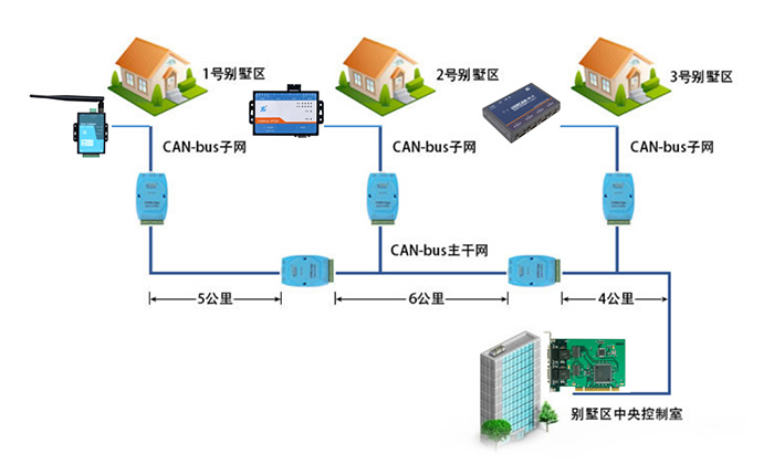 2) 使用CAN转光纤设备(CANHub-AF2S2),光纤抗干扰能力强,传输距离一般是CAN传输距离的2倍;
