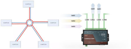 对于星型拓扑结构来说需要注意的是每个分支的终端电阻的匹配,一般等距离分支终端电阻R=N(分支数)*60即可,如果不等距,需要根据实际情况进行匹配,星型组网一般推荐使用(CANHUB-AS4)集线器,能够有效隔离子网络的干扰,延长通讯距离。