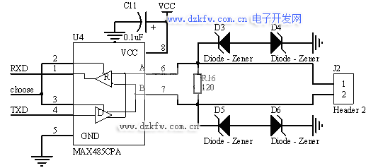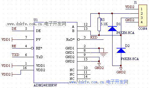 在某些工业控制领域,由于现场情况十分复杂,各个节点之间存在很高的共模电压。虽然RS-485接口采用的是差分传输方式,具有一定的抗共模干扰的能力,但当共模电压超过RS-485接收器的极限接收电压,即大于+12V或小于-7V时,接收器就再也无法正常工作了,严重时甚至会烧毁芯片和仪器设备。