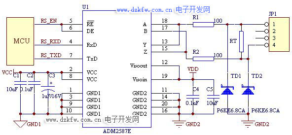 图4、完全隔离型RS485/422芯片ADM2587E应用图