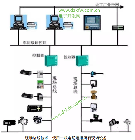 (2)现场设备高度智能化,提供全数字信号;一条总线连接所有的设备。