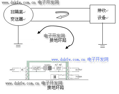 1. 接地环路问题:如下图所示,当过程环路中有两处或两处以上接地电阻不相等时,就会产生接地环路,过程信号就会失真。