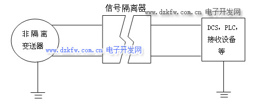 第三种方案是在过程环路中使用信号隔离器。信号隔离器采用隔离技术,断开过程环路中的直接电路(直流通路)但又不影响过程信号的正常传输,从而彻底解决了上述问题。如下图:
