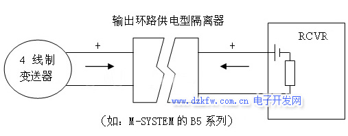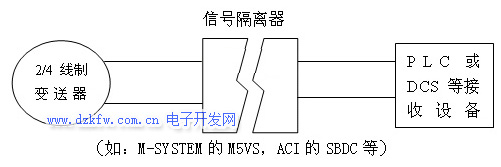 4线制外部供电型信号隔离器,又叫隔离配电器(如:日本M-SYSTEM的M5DY系列,美国ACI的SBDY系列等),具有向2线制变送器供电的功能,由此可以免去为变送器再配置电源的麻烦。并且也提供了信号隔离功能。如下图: