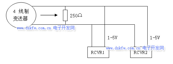 在实际应用中,我们经常遇到将一个变送器信号接入两个或两个以上接收装置的情况,若采用串联环路,则环路中任一处开路都会造成整个环路上的仪表无信号,同时负载电阻之和很容易超过变送器的负载能力,所以一般不采用这种方式。通常采用的方式是:在环路中串接一个电阻,再将负载并联在电阻上以取得电压信号,如串接一个250Ω电阻将4-20mA电流信号转换成1-5V电压信号。如下图: