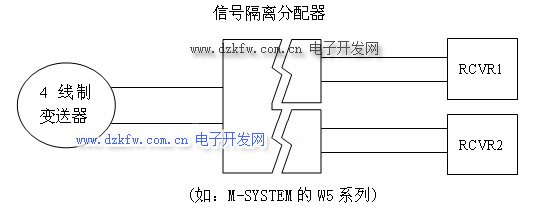 上图中,两输出信号既可相同也可互异,变送器、RCVR(接收设备)间完全隔离;任一接收设备出现故障,不会影响整个环路及另一套设备。