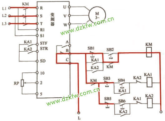 变频器外接继电器控制正反转电路如下图: