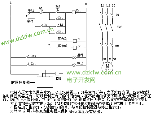 电接点压力表常用在水塔自动上水装置上,Q1是空气开关,为了维修方便。KM2接触器被时间控制器控制,可以控制在制订的时间给电,在不给电的情况卞即是压万罐没水也不工作。KM1为上水接触器,它由中间继电器K1 K2电接点压力开关 KM1的常开辅助触头控制。为了增加手动的方便,SA1 SA2及KM1的常开辅助触触头控制KM1使电机工作与停止。本图增加了指示灯,分别由KM1的常开与常闭控制运行与停止指示灯。另外KM1后可以增加热继电器来保护电机。本图没有给出。