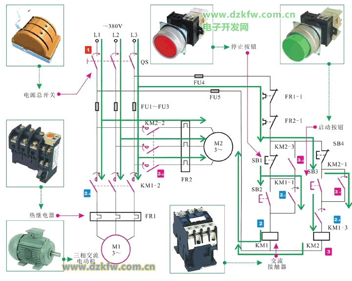 2-2动合主触点KM1-2接通,电动机M1开始运转。