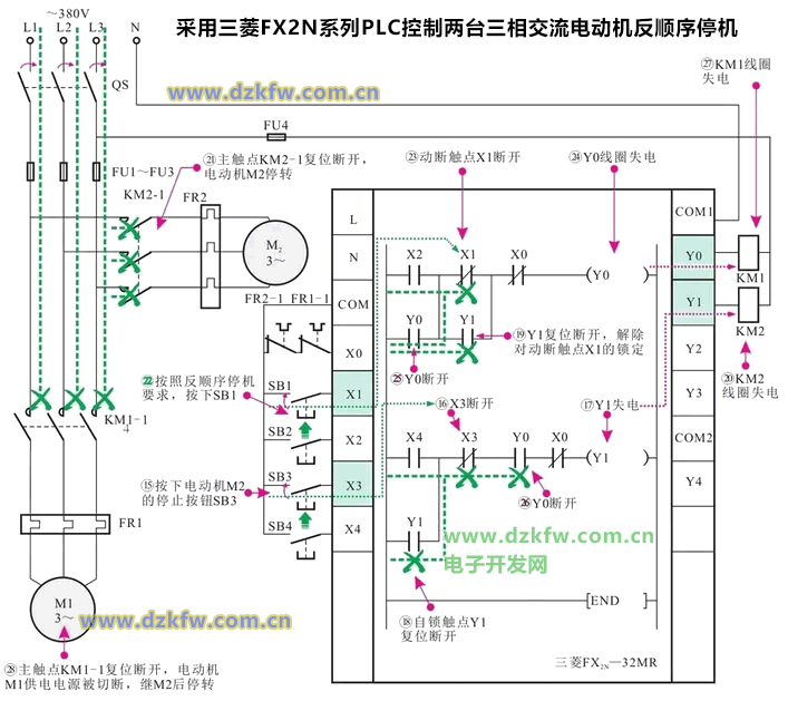 采用三菱FX2N系列PLC控制两台三相交流电动机反顺序停机的过程: