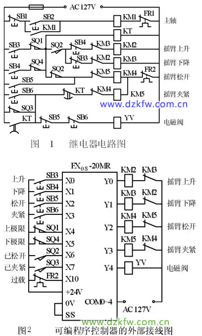 图1是某摇臂钻床的继电器控制电路原理图。钻床的主轴电机用接触器KM1控制,摇臂的升降电机用KM2和KM3控制,立柱的松开和夹紧电机用KM4和KM5控制。图2是实现具有相同功能的PLC的外部接线图和梯形图。