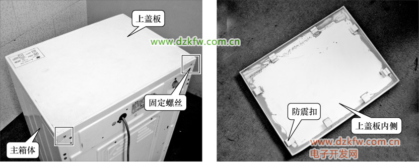 滚筒洗衣机的上盖板是由塑料原料制成,在其内侧设有防震扣,与连接板上的海绵垫接触,用于减小滚筒洗衣机工作过程中上盖与主箱体之间的震动,上盖板与主箱体是通过后端的2个固定螺丝进行固定的,如下图所示。