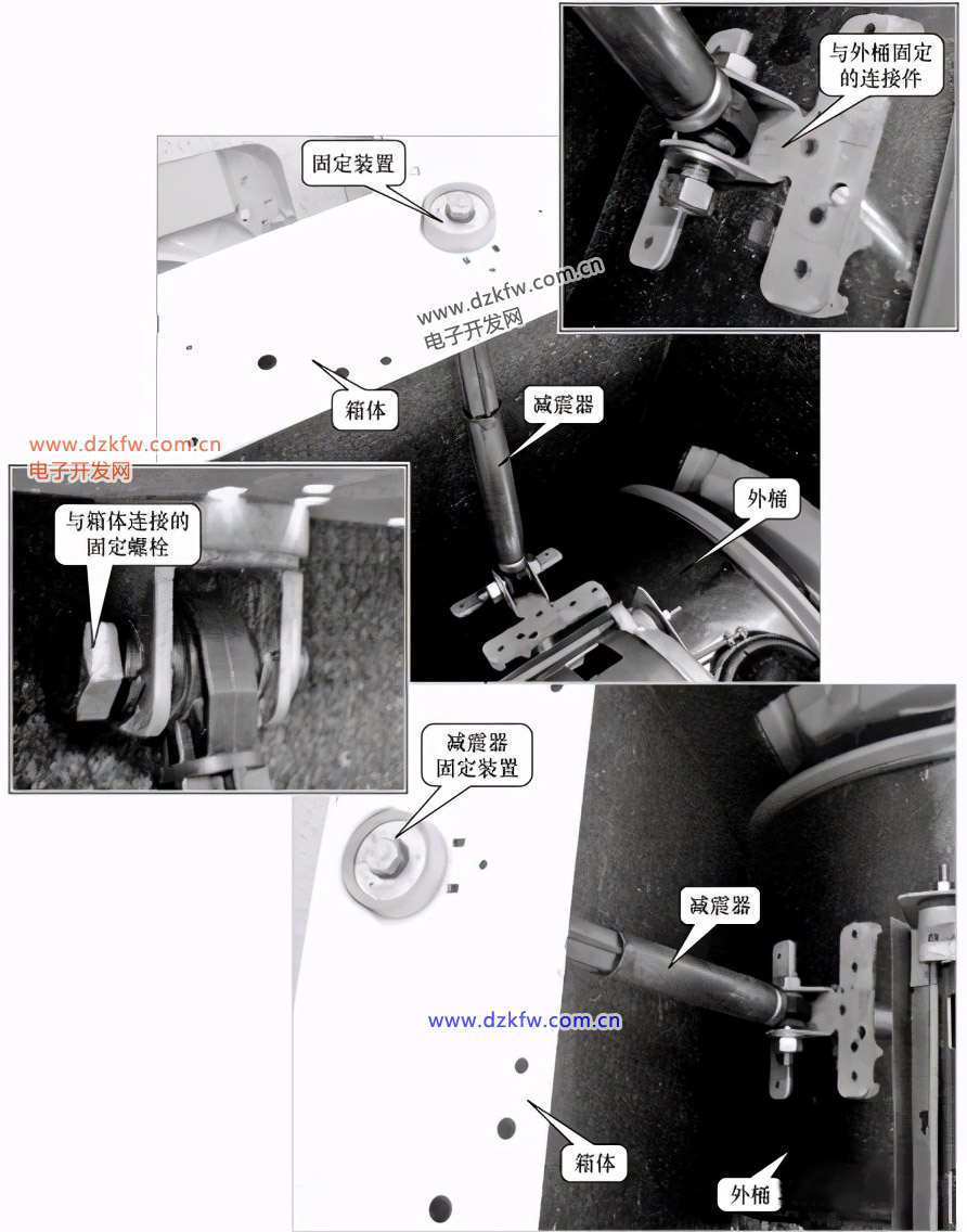 滚筒洗衣机的支撑减震装置主要包括吊装弹簧和减震器。