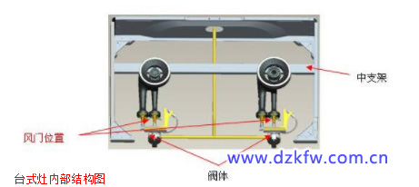 下进风:即燃烧所需的空气主要从灶的下边进来(这种燃气灶的底壳上设有进空气的孔和调节空气大小的风门)如图,火盖中间向下是通的。