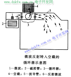 在微波腔中,具有高介质耗散因子的样品可吸收几乎100%的输人功率,这种条件下微波系统处于完全匹配状态。而微波消解时用的酸在2450MHz 的频率下介质耗散因子较低,因而产生反射功率,反过来导致磁控管和微波腔之间的不匹配,并因为磁控管的过热而改变磁控管的输出功率。目前已经设计出了消除微波反射的装置,在出现不匹配时可以保护磁控管,并使磁控管给出稳定的输出功率。微波辅助样品前处理系统中最常用的设备是终端循环器。终端循环器是一个用铁氧体和静磁场构成的装置,这种装置使微波正向通过,而把反射波送入空载中变成无害的热量损耗(如图所示)。