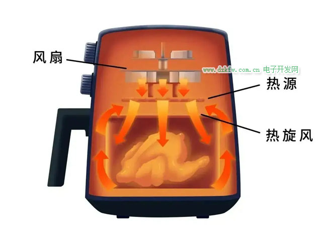 空气炸锅是实现空气炸的设备,其构造比较简单。现在的空气炸锅基本上是一个高转速的风扇下面接一个螺旋加热管,加热管周围配上温度传感器,再搭配一个装食材的炸锅(炸篮)。机器运转时风扇高速旋转,不断地将加热管附近的高温空气吹向炸锅,使炸锅内的空气快速循环,最终达到高温空气包裹食材的效果。