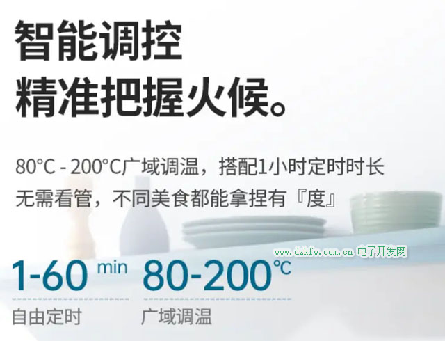 重要参数二:温控加热装置的第二个重要参数是温控,也就是温度传感器的灵敏度。空气炸锅也好,烤箱也好,能做到精准控温,腔内温厂均匀是很难的,但是控温越准,做出来的食材受热越均匀,小白操作的成功率也越高。对于空气炸锅来讲,提高温控精确度的方式主要为增加温度传感器的数量和质量,提高风扇转速,增加扇叶数量,加大扇叶面积。