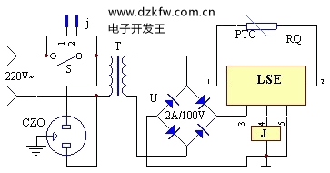 先在电水壶上用环氧树脂沾牢一只片状正温度系数的开关型热敏电阻RQ。将RQ的两端接到LSE的①、②脚,将水壶插入电源插座CZO中,揿下电源开关S,此时由于电水壶中的水温较低,RQ的阻值较小(<50K),故LSE的④脚输出高电平,继电器J立即吸合,常开触点j闭合,电水壶通电工作。松开手后,继电器J触点自保。一旦水沸腾(100℃),RQ的阻值阶跃上升,远大于50K,相当于LSE的①、②脚回路断开,故LSE的④脚输出低电平,J释放,其触点j断开,彻底切断了电水壶的电源,使主人烧水后外出无后顾之忧。其中RQ应选用正温度系数的开关型热敏电阻,其居里点为100℃。