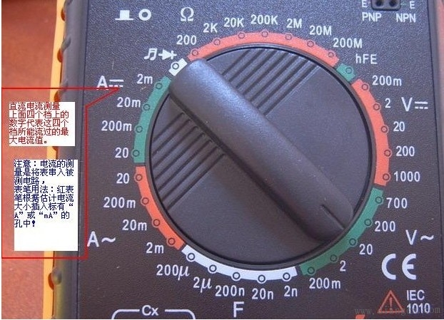 交流电流的测量。测量方法与1相同,不过档位应该打到交流档位,电流测量完毕后应将红笔插回“VΩ”孔,若忘记这一步而直接测电压,哈哈!你的表或电 源会在“一缕青烟中上云霄”--报废!