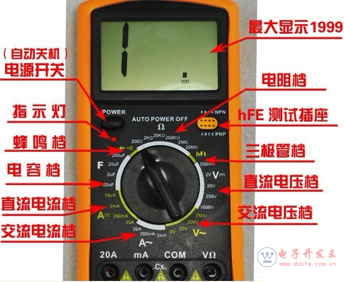 表笔插位同上;其原理同二极管。先假定A脚为基极,用黑表笔与该脚相接,红表笔与其他两脚分别接触其他两脚;若两次读数均为0.7V左右,然后再用红 笔接A脚,黑笔接触其他两脚,若均显示"1",则A脚为基极,否则需要重新测量,且此管为PNP管。那么集电极和发射极如何判断呢?数字表不能像指针表那 样利用指针摆幅来判断,那怎么办呢?我们可以利用“hFE”档来判断:先将档位打到“hFE”档,可以看到档位旁有一排小插孔,分为PNP和NPN管的测量。(http://www.dzkfw.com.cn/ 版权所有)前面已经判断出管型,将基极插入对应管型“b”孔,其余两脚分别插入“c”,“e”孔,此时可以读取数值,即β值;再固定基极,其余两脚对调; 比较两次读数,读数较大的管脚位置与表面“c”,“e”相对应。