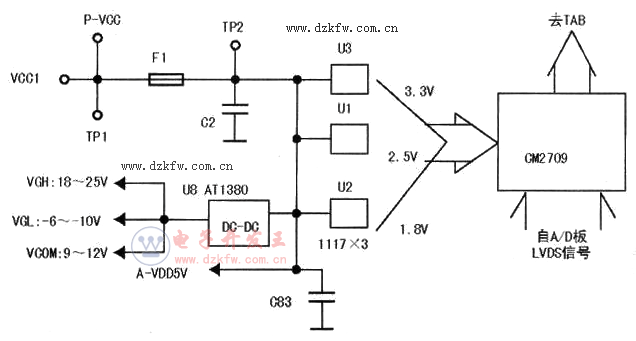 如果TP1有电压,而TP2无电压,则说明屏供电的负载电路有严重短路元件。最常见的是电源滤波的贴片电容漏电或严重短路,DC-DC元件击穿损坏造成保险Fl烧断开路。如果TP2有电压,但低于正常值,说明屏供电的负载电路有漏电或轻微短路元件。检修时,直接测量TP2的对地电阻。如果TP2对地电阻在300Ω左右,则查3.3V、2.5V、1.8V(有的屏不一定有这个电压)负载,通常是三端精密稳压器(如1117系列)性能不良、主控芯片(本机为CM2709,相对其他方案,这种芯片的损坏率比较高)损坏;若TP2对地电阻在100Ω左右,则查DC-DC调节电路。屏DC-DC电路的功能是为屏内部的行、场阵列模块提供正常工作所需的各组电压。虽然屏的型号非常多,每个厂家对这些电压的标注并不统一,但原理都是一样的,所以,可以用“栅极电压”来加以概述(详细的工作原理,可参考杂志社出版的《液晶显示器维修实战教程》的相关章节)。如图1所示:VGH,指栅极高压,一般在18V~25V之间;VGL,指栅极低压(负压),一般在-6V~-10V之间;VCOM,指共栅极电压,一般在9V~12V之间。还有一个VDDA,这个跟屏供电P-VCC接近,本机为5V。通常,这些电压在逻辑板的PCB上都有明显的标注。