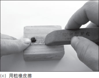 一刮:刮就是焊接前要按照图3所示,做好被焊金属物表面的清洁工作,可用小刀、废钢锯条等刮去(或用细砂纸打磨掉、用粗橡皮擦除)焊接面上的氧化层、油污或绝缘漆,直到露出新的金属表面。自制的印制电路板在焊接前,也需要用细砂纸或水砂纸仔细将覆铜箔的一面打亮。"刮"是保证焊接质量的关键步骤,却常常被初学者所忽视,刮不到位,就镀不好锡,也不好焊接。需要说明的是,有些元器件引线已经镀银、金或经过搪锡,只要没有氧化或剥落,就不必再去刮它,如表面有脏物,可按照图3(c)所示用粗橡皮擦除。粗橡皮的选择以绘图用的大橡皮效果最好。有些镀金的晶体三极管管脚引线等,在刮掉镀层后反而会难以镀上锡。无论采取何种形式的"刮",都要注意不断旋转元器件引脚,务求将引脚的四周一圈全部清洁干净。