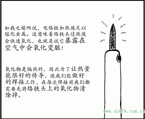 如我之前所说,电烙铁加热後足以熔化金属。这意味着烙铁头过热後会快速氧化,也就是说它暴露在空气中会氧化变脏!氧化物是隔热的,因此为了让热量能很好的传导,使我们能做好的焊接工作,在每次焊接前我们都需要先将烙铁头上的氧化物清除掉。