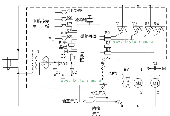 不管是哪款洗衣机的电气控制系统,它们控制的主要对象都是一回事了,也就是进水电磁阀和排水电磁阀以及电动机;它们的检测传感机构也差不多,也就是盖(安全)开关和水位(压力)开关,下边是基本的控制电路图