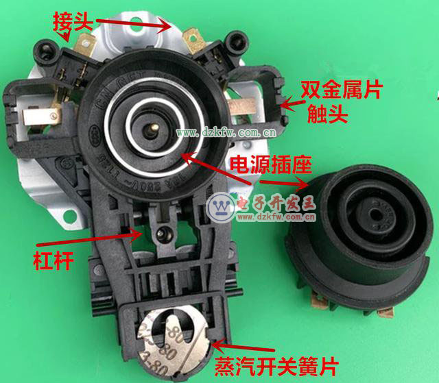 3.水开以后不能断电;这是蒸汽开关失灵所致,由于这个装置频繁动作,且处于潮湿工况,因此这是一种最常见的故障。大多数情况下是生锈所致,也可能材质不良,时间长了性能改变,如果有生锈等异物清除即可;还有可能是蒸汽导管错位蒸汽到不了簧片上;