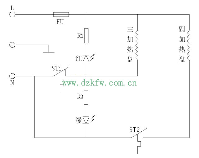 3.保温式电水壶之二:这种电热水壶的保温电路是串联了一个电阻,只能维持较低的温度,不能持续加热;当水开之后,温控器ST1断开,R1串入电路,加热盘继续加热。指示灯反映不同的工作状态。