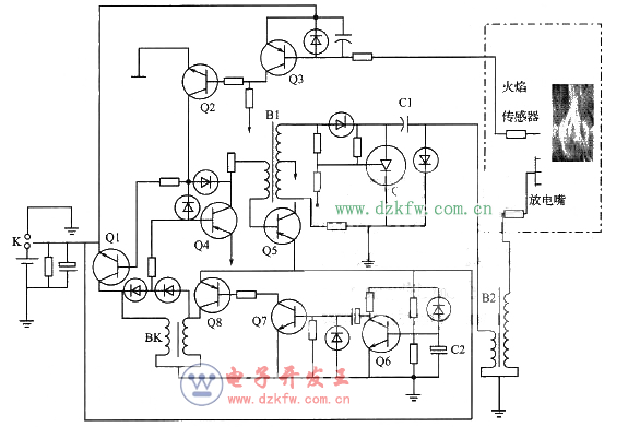 点火脉冲的控制主要由Q6、Q7、Q8及其外围元器件来完成,产生点火脉冲时,其维持时间的长短由C2决定,C2的容量越大,点火时间越长,反之,则点火维持时间就越短。
