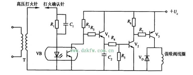 VT3、T1等元件组成电感反馈式振荡电路,偏置电阻R10、R11确定VT3的直流工作点,即振荡强弱,VD2是保护二极管。T1次级(5)-(7)绕组输出的高压经VD8半波整流后,通过触发变压器T2初级为C4充电,同时经限流电阻R12为触发电容C3充电。当C4两端电压约升至200V时,C3两端电压使双向二极管VD3导通,并触发单向可控硅VS导通,c4经VS、T2初级迅速放电,T2次级感应出约12kV的脉冲高压,通过点火针对地(机壳)放电,引燃小火(俗称常明火),完成一次放电点火过程。随后C3、C4又被充电,进行新一轮放电,放电频率由R12、C3的时间常数决定。