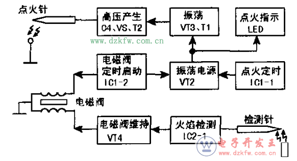 该热水器控制电路由点火定时、振荡电源控制、振荡、点火指示、脉冲高压产生、火焰检测、主电磁气阀启动控制及维持等单元电路组成,其组成框图如图所示,电路原理图如图所示。
