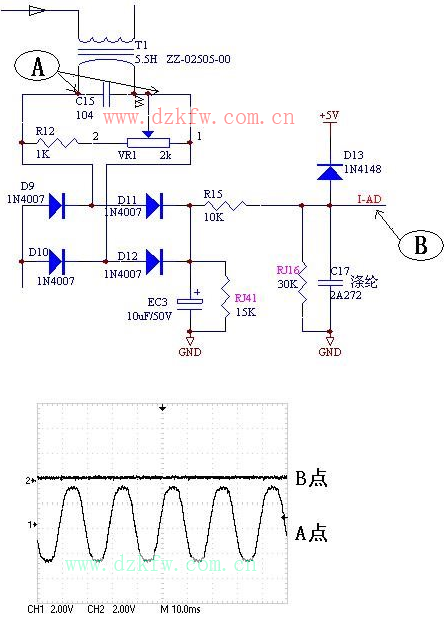 电流互感器T1的次级测得的交流(AC)电压。经D9~D12组成的桥式整流电路整流,EC3电解电容滤波平滑、由电阻R15、RJ41、RJ16分压后,所获得的电流电压送到CPU,该电压越高表示电源输入的电流越大,待机时电流取样基本为零,如图3.1所示,电流越大,A点的电流电压波形幅值越高,B点的取样点就越高,表示功率越大。电容EC3选值时不应太大,如果太大了,会造成电容充放电时间太长,影响读取电流AD时间,从而会导致开机时,功率上升的时间很慢。