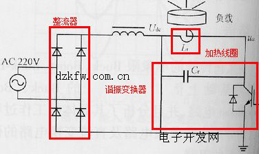 下图为电磁炉的基本电路原理图。电磁炉的主电路是一个AC-DC-AC(交流-直流-交流)的变换器,由桥式整流器和电压谐振变换器构成。电压谐振变换器是主电路的核心,其作用是使直流电逆变为高频交流电,以满足感应加热的要求。