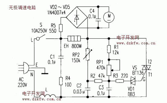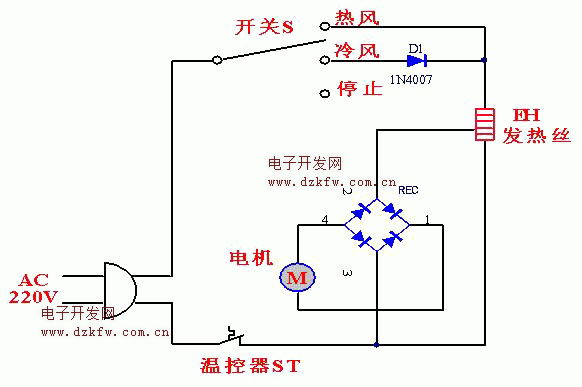 工作过程:这个电风吹具有“热风”、“暖风”、“停止”三挡 , 主要由功能转换开关S、直流电机M、温控器ST、桥堆REC和发热丝EH等组成。将电源插头插入市电插座220V交流供电, S置于“热风”挡, 220V 交流电源通过EH 降压(从EH 的抽头处引出)加至全波整流获得约24V 直流电压供M工作, M带动风叶快转吹出热风。将S置于“暖风”挡, 220V交流电源经整流管REC半波整流, M带动风叶慢转吹出暖风。