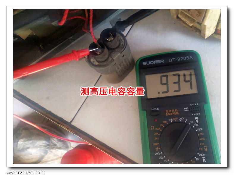3、检查高压电容好坏情况。方法一:用指针万用表R×10K档测电容阻值,正常电容放电后阻值为10MΩ左右,阻值无穷大则损坏