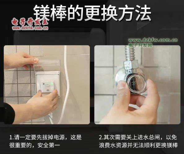 ①首先关闭电热水器的电源,将插头拔出来,接着关闭自来水至热水器的阀门。一般逆时针拧出,顺时针拧紧,另外购买镁棒时可能送你有一点生料带,在安装新镁棒时,缠绕在镁棒最外层螺栓的丝口处,保证热水器通水后不漏水。