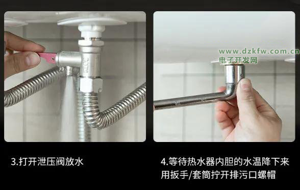 ②找到排污口位置。大部分排污口在热水器左下侧,个别型号在面板里面,需要先拆卸面板螺丝和进出水管,取下面板,露出排污口。