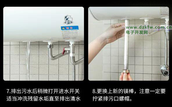 ③注意拆卸电热水器时,一定要保证内部的水温不要太高,最好是保证是常温水,免得拆卸后过高的水烫手,引起不必要麻烦。用专用扳手或活动扳手拆下镁棒,此时可以在不通电的情况下,打开自来水开关,将内部的残渣余孽清洗干净,估计有不少的黄啦啦的绣水流出来,待不再流出锈水时关闭水阀。