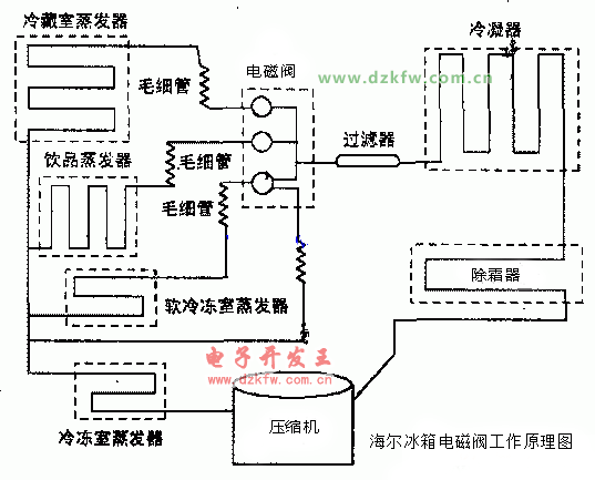 在压缩机工作,但冷藏、冷冻、变温或微冻中某一室或二室、三室不制冷时,应着重检查电磁阀(有一室能工作)。具体操作方法如下; 1 单稳定态电磁阀的检修