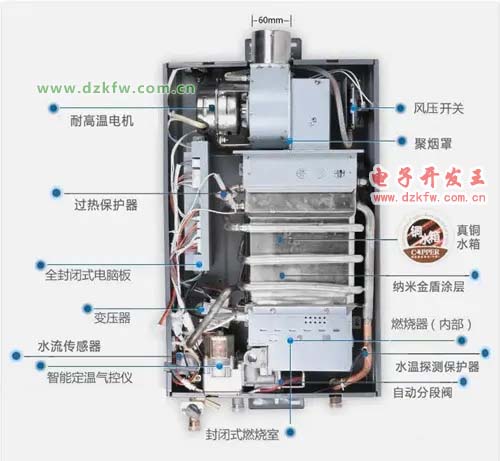 使废气快速的排除到室外。一旦水温达到50度以上,不适于人体温度的时候,此功能开关就会开启,限制温度控制器工作,切断点与熄灭燃气。